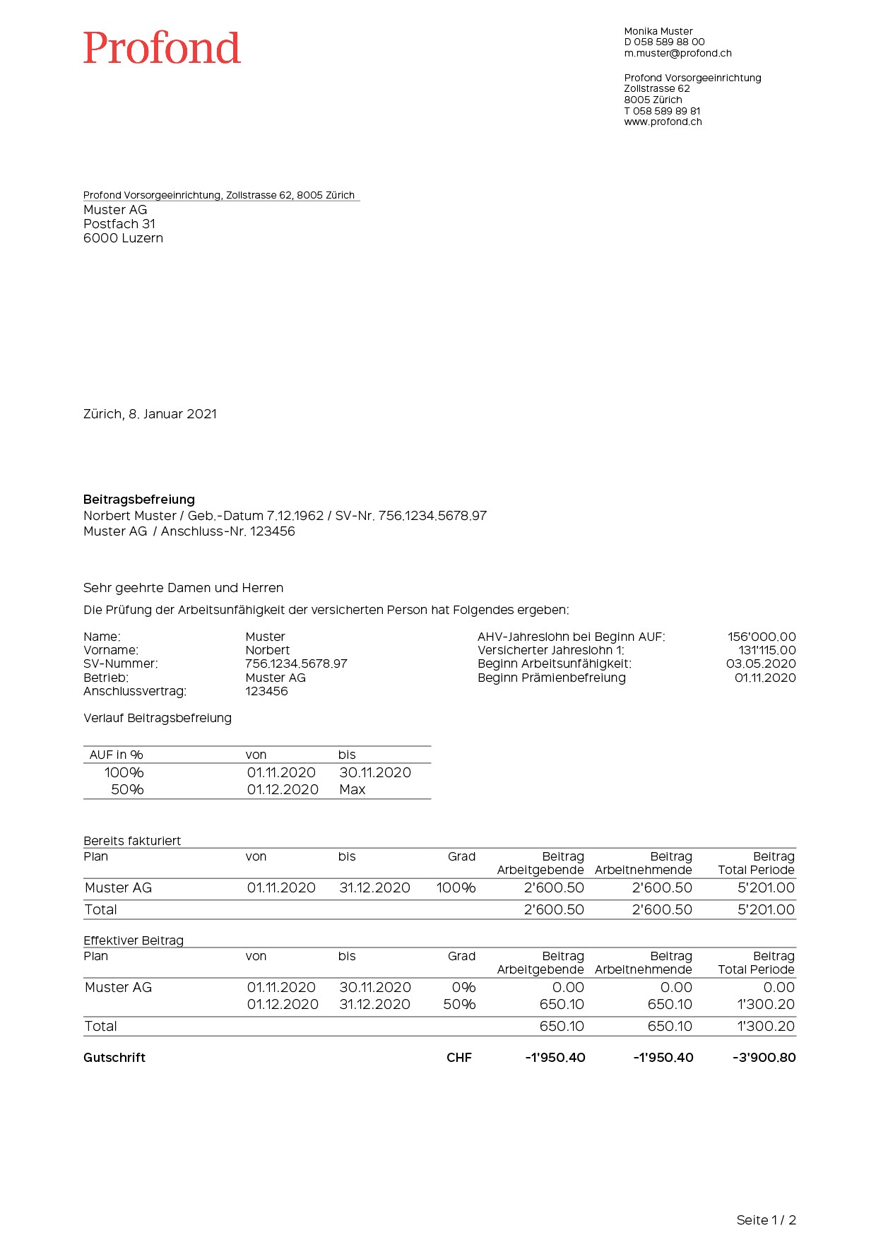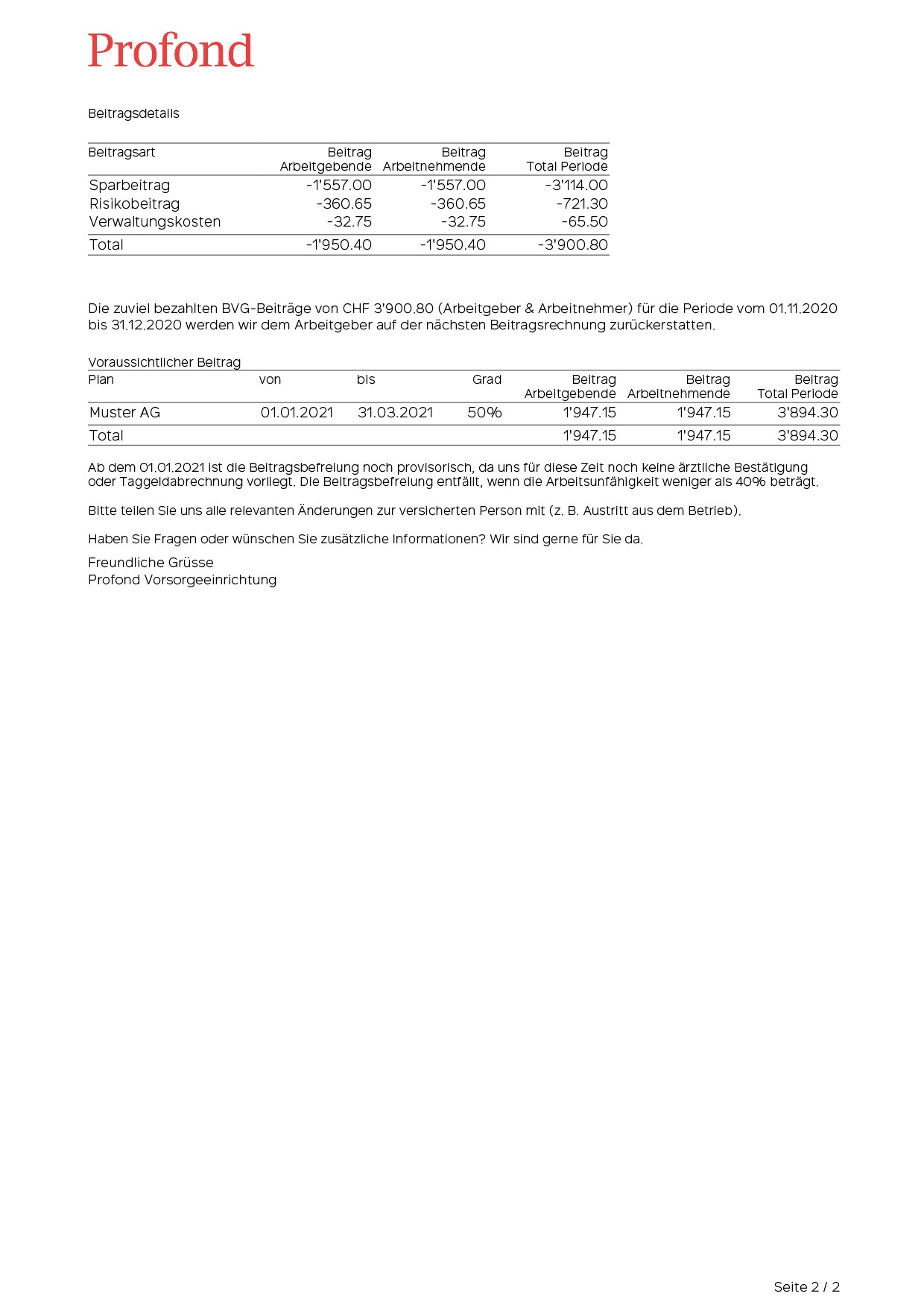 Der voraussichtliche Beitrag zeigt, was Arbeitgeber der versicherten Person zukünftig abziehen müssen. Bis Profond die nächste Beitragsbefreiung bestätigt, wird hier der voraussichtliche Beitrag aufgelistet.