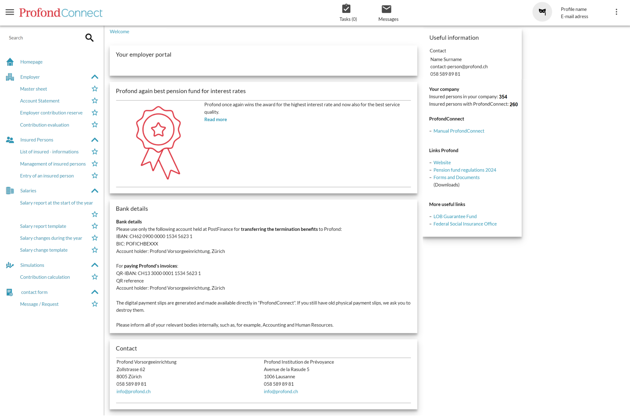You will be provided with access to our online portal ProfondConnect for an easy, fast and secure collaboration. This allows you to have an overview of your employees' insurance data and to view your invoices, bookings or credits at any time and to make changes and notifications directly in the portal.