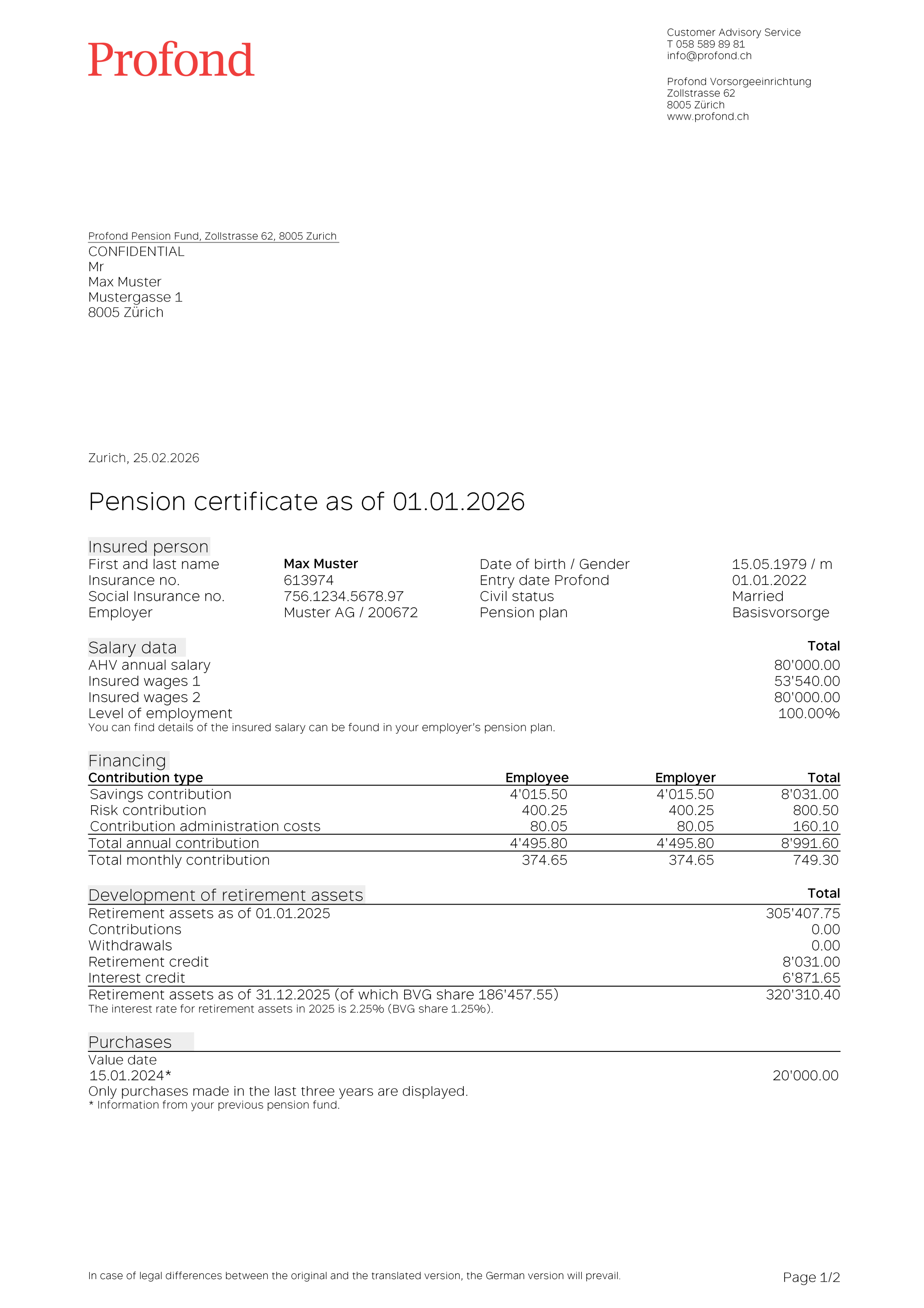 On your pension certificate you can see how much money (retirement assets) you have already saved and what benefits you can expect in the event of retirement, disability or death.