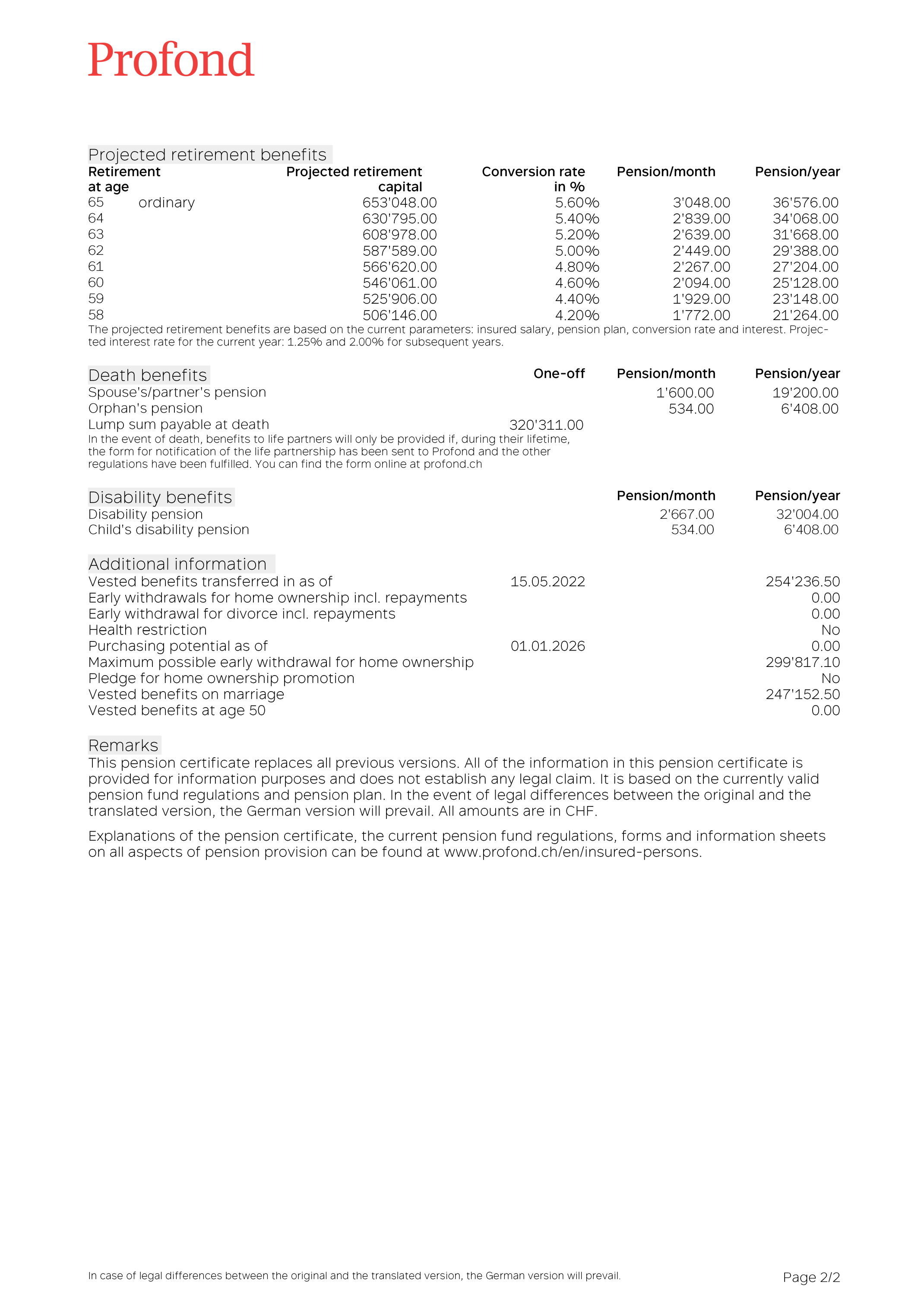 If your insured salary or your pension plan changes, the extrapolation of your retirement assets will be adjusted accordingly. The interest actually paid also affects the amount of your assets. The conversion rate at which the assets are converted into a pension may also change. As a result, your pension may be higher or lower. Profond generally announces the valid conversion rate years in advance.